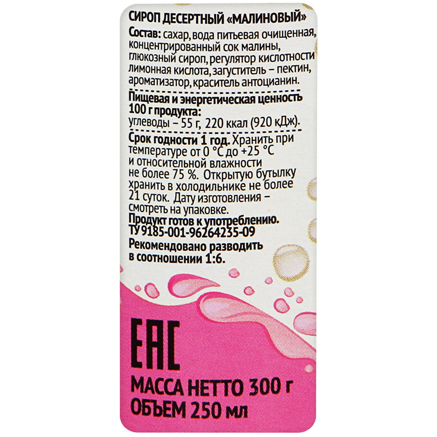 - Состав сахар, вода питьевая очищенная, концентрированный сок малины, глюкозный сироп, регулятор кислотности лимонная кислота, загуститель- пектин, ароматизатор, краситель антоцианин