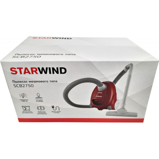 Пылесос Starwind SCB2750 красный/серыйПылесос STARWIND SCB2750 предназначен для сухой уборки гладких и ковровых покрытий: ковролина, линолеума, паркета и пр. Высокий уровень мощности (1800 Вт) делает уборку простой и быстрой. В комплектацию входит несколько видов насадок: щелевая и пол/ковер. Они эффективно собирают пыль, волосы, шерсть животных, крошки и пр. Для труднодоступных мест можно использовать щелевую насадку.В конструкции предусмотрен фильтр тонкой очистки. Он считается лучшим среди прочих устанавливаемых фильтров на пылесосы и системы очистки воздуха. Это делает устройство подходящим для использования людьми, которые страдают от аллергии или тех, кто требовательно относится к гигиеничности и чистоте.Большой емкости мешка (2 л) хватает для уборки многокомнатной квартиры. Это дает возможность реже очищать мешок и соответственно экономить время на уборке. Когда мешок полностью заполняется, срабатывает световой индикатор. Составная труба регулируется под рост пользователя.На задней части корпуса есть специальное крепление для фиксации ручки в вертикальном положении, что очень удобно в процессе уборки, так как не нужно отвлекаться и думать куда на минуту пристроить трубу. За счет небольших размеров подходит для компактного хранения на полке в шкафчике или отсеке кладовки. Выделяет данную модель среди других аналогов особенный дизайн: стильный серый удачно скомбинирован с ярким красным цветом, а плавные линии добавляют обтекаемости и делают корпус еще более зрительно привлекательным.