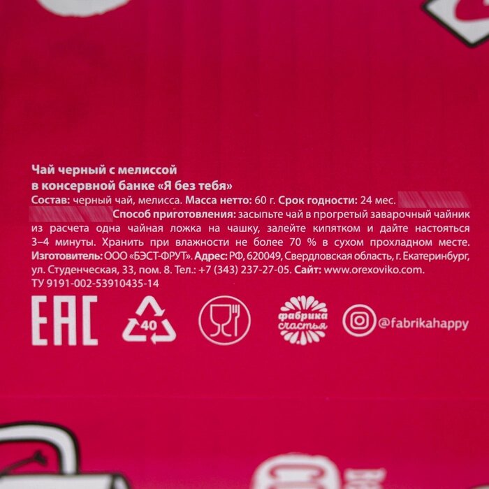 Чай чёрный «Я без тебя»с мелиссой, 60 гр.