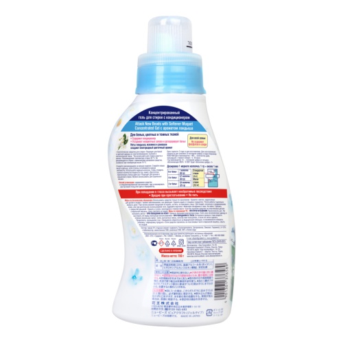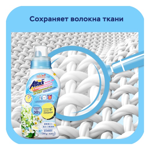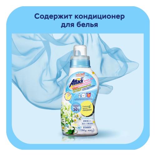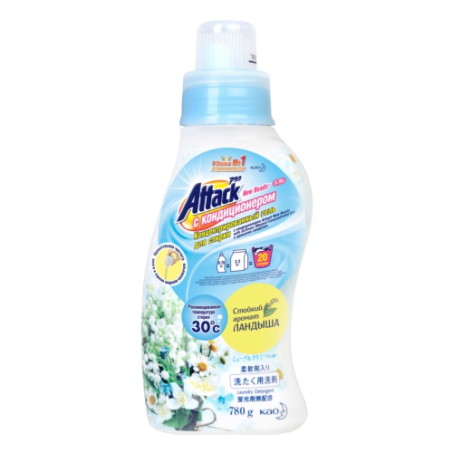 Концентрированный гель для стирки ATTACK с кондиционером Ландыш New Beads 0,78кгКОНЦЕНТРИРОВАННЫЙ ГЕЛЬ ДЛЯ СТИРКИ с кондиционером, аромат ландыша. Содержит кондиционер, устраняет неприятные запахи и дезодорирует белье. Ноты ландыша, жасмина и ромашки создают благородный и вдохновляющий цветочный аромат. Для стирки белого, цветного, темного и черного белья (хлопок, лен, синтетика), для всей семьи. Безупречно отстирывает в холодной воде, что позволяет носить любимые вещи дольше, снизить время стирки и расход электроэнергии. Проникает глубоко в волокно и вымывает въевшуюся грязь, засаленность и неприятные запахи. Предотвращает тусклость ткани, не оставляет белых разводов. Не содержит фосфатов и хлора, легкий и прохладный аромат.