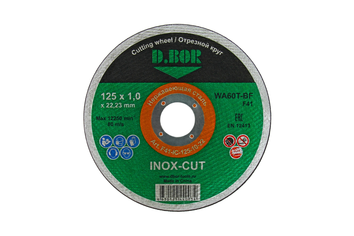 Диск отрезной по нержавеющей стали INOX-CUT (125x1.0x22.23 мм; WA60T-BF; F41) D.BOR F41-IC-125-10-22 предназначен для резки листового материала, труб, профилей и прутков маленького диаметра.
