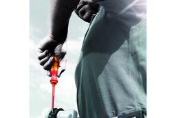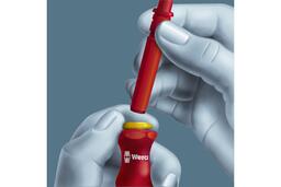 Стержень KRAFTFORM KOMPAKT 60i WERA WE-003400 является составной частью отвертки и используется совместно с ручкой-держателем Wera. Стержень легко соединяется с ручкой без применения дополнительных инструментов и принадлежностей. Используется для заворачивания винтов с прямым шлицем при работах под напряжением до 1000 В. Привод имеет вид шестигранника размером 9 мм с направляющим скосом, исполнение вороненое в форме конического острия. Рабочий конец изолирован в соответствии со стандартом IEC 60900 : 2004. Поштучная проверка каждого инструмента в условиях водяной бани при нагрузке 10000 В, которая в десять раз превышает максимально допустимую, гарантирует безопасность использования стержня под напряжением.