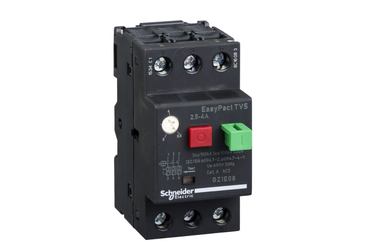 Автоматический выключатель Schneider Electric 2.5-4А GZ1E08 3-полюсный применяется в сетях до 690 В переменного тока для защиты электродвигателей. Монтаж - на симметричную, несимметричную или комбинированную рейку. Управление с помощью кнопки. Имеет защиту от перегрузки и КЗ. Диапазон уставок защиты от перегрузки 2.5-4 А. Уставка защиты от КЗ Id = 51 А.
