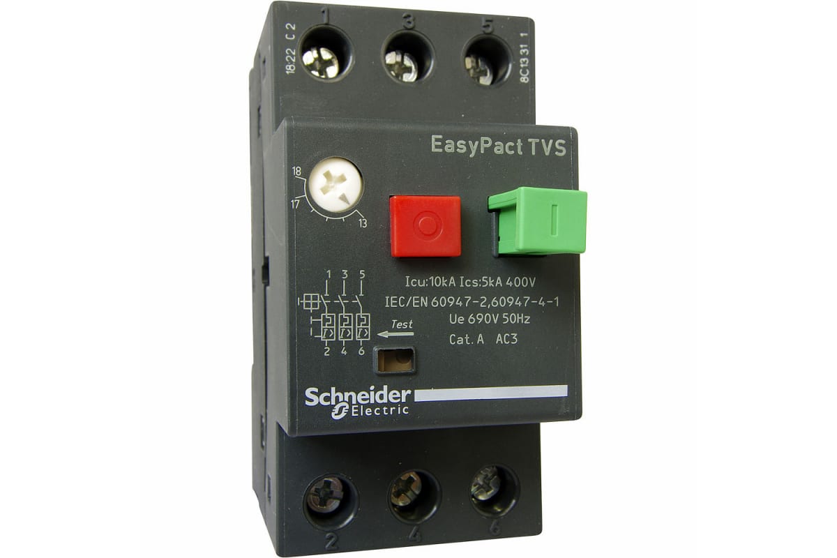 Автоматический выключатель Schneider Electric 1.6-2.5А GZ1E07 3-полюсный применяется в сетях до 690 В переменного тока для защиты электродвигателей. Монтаж - на симметричную, несимметричную или комбинированную рейку. Управление с помощью кнопки. Имеет защиту от перегрузки и КЗ. Диапазон уставок защиты от перегрузки 1.6-2.5 А. Уставка защиты от КЗ Id = 33.5 А.