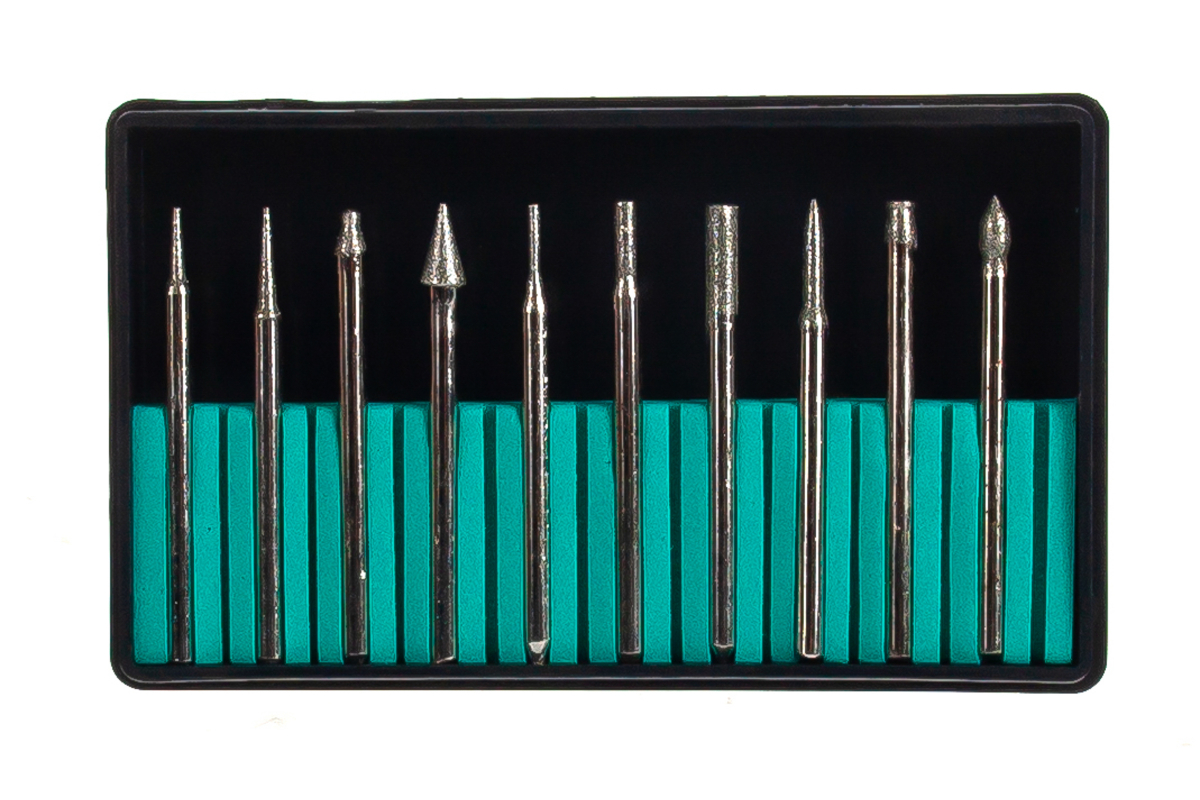 в набор входит 10 фрез разного диаметра и формы: от цилиндрической до шарообразной.