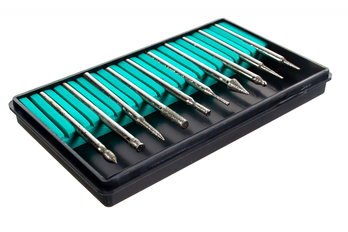 Шарошки усиленная сталь с алмазным напылением 10 шт. FIT 36484 предназначены для создания сложных фигурных углублений в металлических поверхностях, устранения острых краев изделия, шлифовки, увеличения диаметра технологических отверстий.