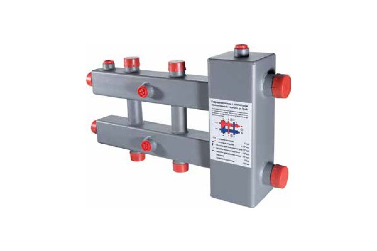 Гидроразделитель с коллектором VALTEC VTc.100.SH.070605 предназначен для гидравлической увязки котла в пятиконтурной системе отопления. Изготовлен из черной стали. Коллекторы имеют прямоугольное сечение. Устройство крепится в горизонтальном направлении. Резьба патрубков котлового контура - 1 1/4", отопительных контуров - 1", для подключения измерительных приборов и дренажных кранов - 1/2". Максимальная подключаемая тепловая мощность - 70 кВт