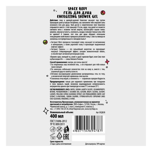 Гель для душа 7DAYS SPACE BODY ENERGIZING бодрящий, 400 мл ВСД028