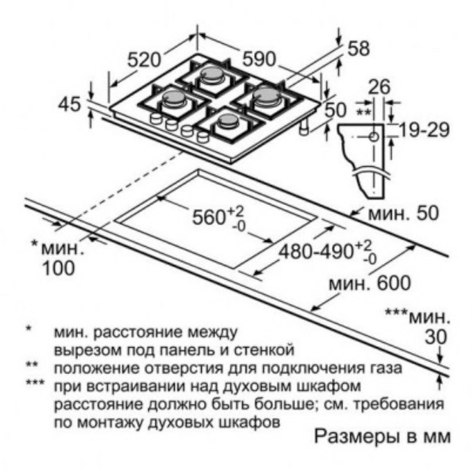 Газовая, 4, эмалированная сталь, поворотные переключатели, газ-контроль, автоматический, чугунные, ширина встраивания 56 см.