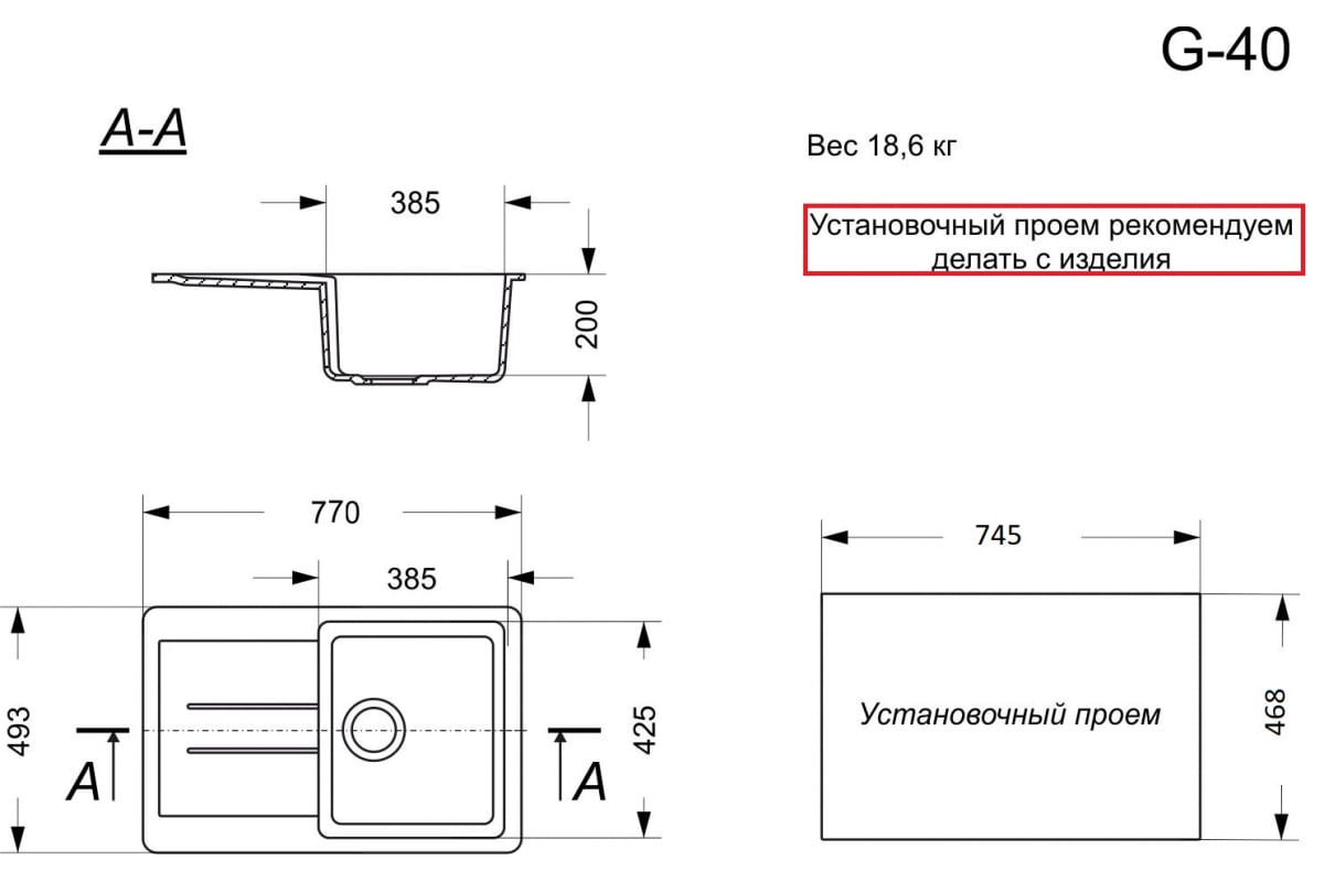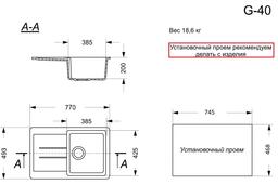 Размер чаши - 425х385 мм. Высота мойки - 200 мм. Установочный проем - 745х468 мм.