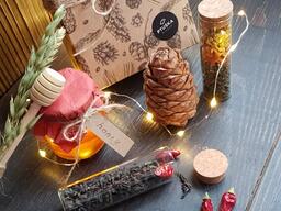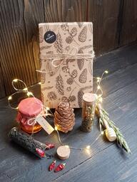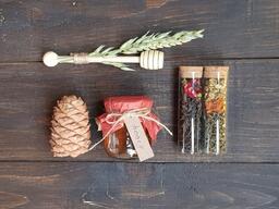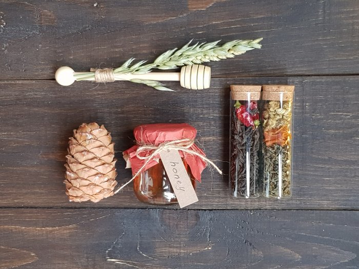 - Содержание набора Состав подарка:• Мед в стеклянной баночке с декором• Чай черный с перчиками чили• Чай зеленый с цедрой апельсина и цветками ромашки• Деревянная ложка для меда• Шишка кедровая• Букетик из сухоцветов• Декор• Крафткоробка, наполнитель, шнур.