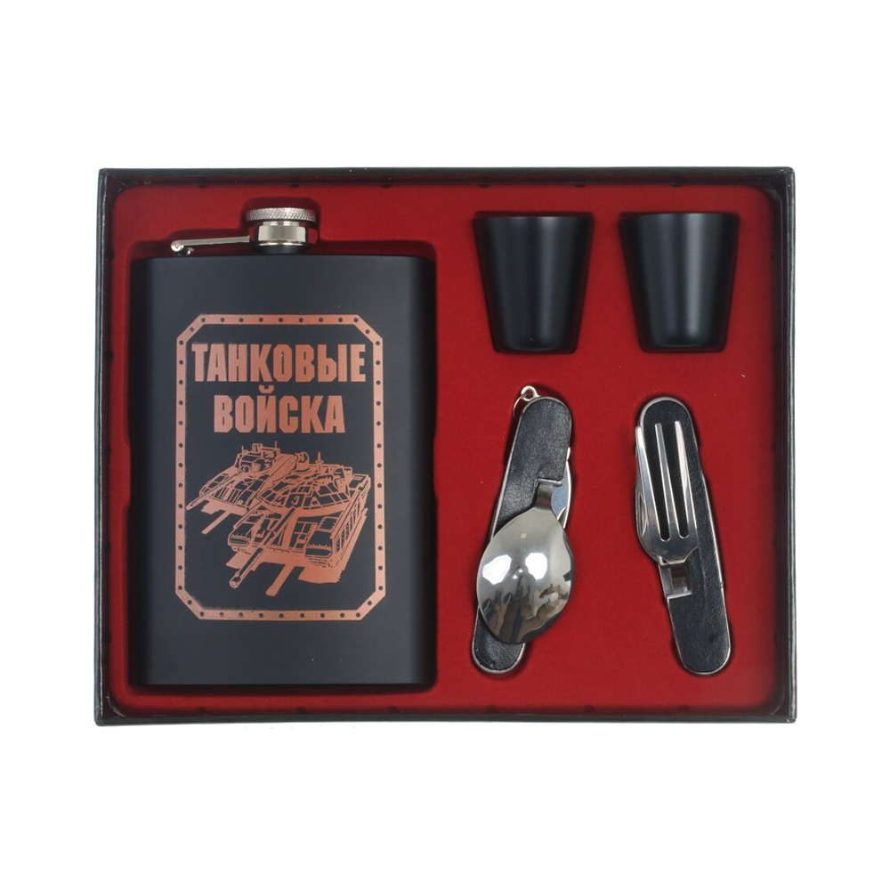 В набор входят фляжка, 2 стопки, вилка с открывалкой и ложка с ножом. Набор является практичным подарком, не занимает много места и его можно брать с собой на пикник, охоту, рыбалку или путешествия.Сообщить о неточности в описании