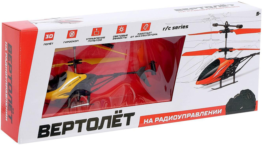 Радиоуправляемый вертолет, оснащен гироскопом, который стабилизирует движение летательного аппарата и не даёт ему сбиться с курса. Автоматически летит вперёд, перемещается вверх, вниз,вправо и влево. Работает от аккумулятора и заряжается от пульта управления. Пульт функционирует от 4 батареек типа АА (в комплектацию не входят).