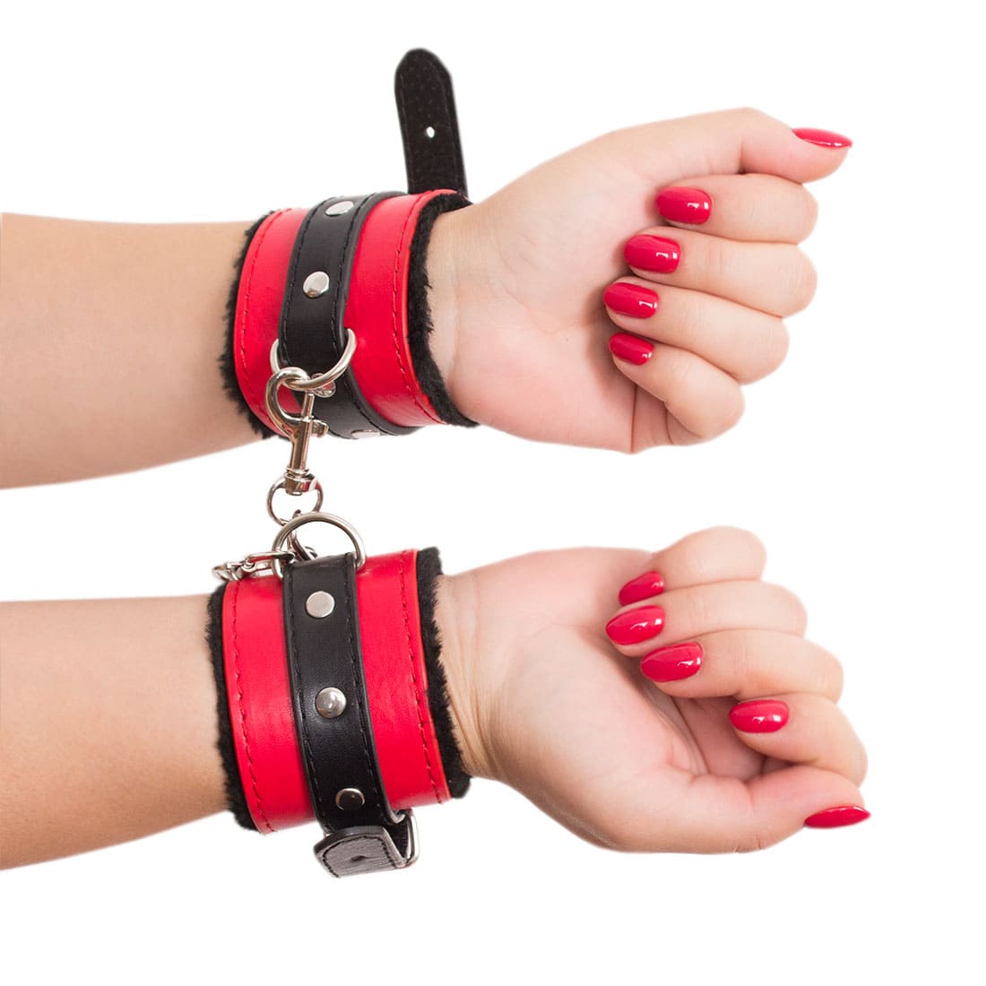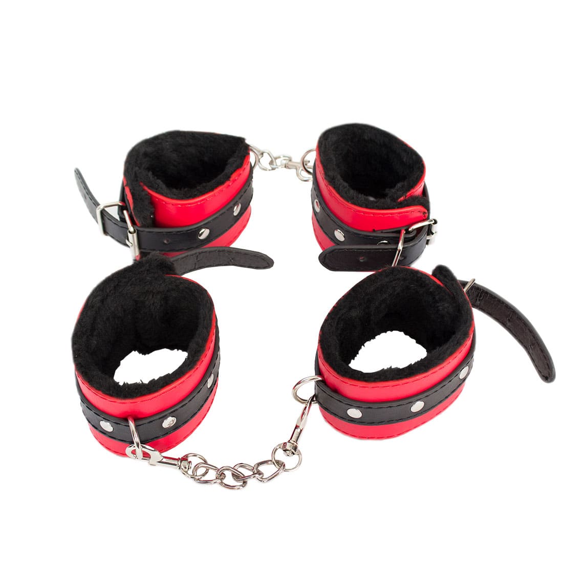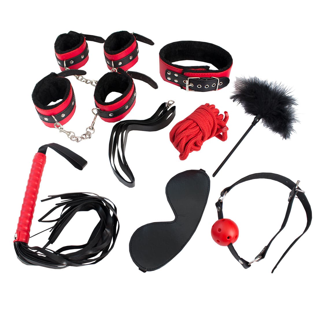 - Комплектация Наручники; оковы; ошейник с цепочкой-поводком; веревка; плетка, кляп; маска; перо.