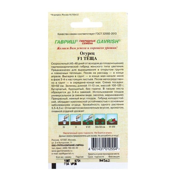 Семена Огурец "Теща" F1, корнишон, скороспелый, партенокарпический, 10 шт.