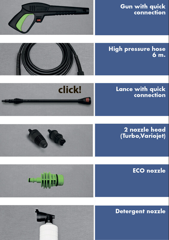 Минимойка Lavor NJ Plus 145 WPS имеет электрический однофазный двигатель мощностью 1900 Вт, который вместе с насосом позволяет подавать воду на выходе с давлением 145 Bar. Максимальная производительность АВД составляет 420 литров в час. Функция автоматической остановки двигателя позволяет экономить электроэнергию, а также предотвращает работу двигателя мойки "в холостую", когда это не требуется. Тем самым продлевается ресурс мотора мойки и ее срок эксплуатации. В комплекте с мойкой вы найдете: пистолет на быстросъемном соединении, шланг высокого давления длиной 6 метров, трубку, сопло, пенное сопло, фрезу, щетку для мойки, вращающуюся щетку, щетку для мытья плитки, пенную насадку, а также адаптер, с помощью которого вы можете подключить входной шланг воды к мойке.