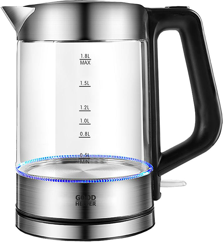 Электрический чайник, мощность 1500 Вт, объем 1.8 л, материал корпуса металл/стекло, нагревательный элемент закрытая спираль, дополнительные функции: подсветка воды, индикация включения, подставка с вращением на 360°.