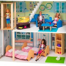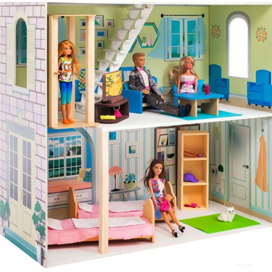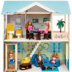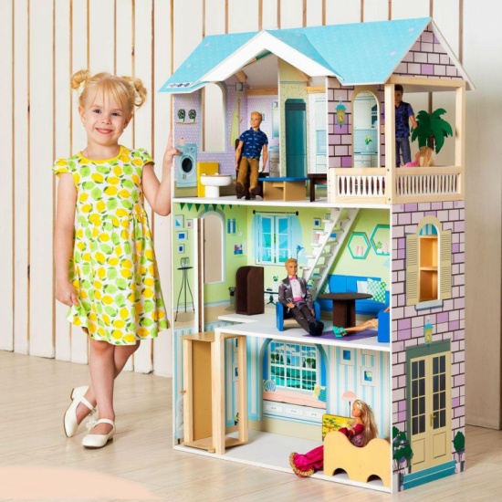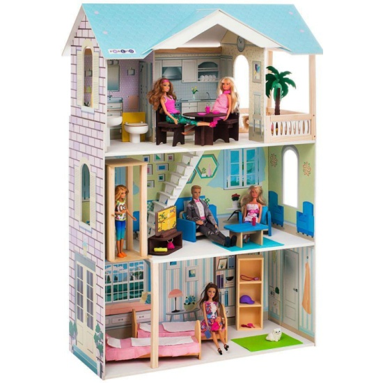 Домик, выполнен в современном стиле, в необычном нежно голубом, благодаря которому доми кажется легким и воздушным. Игрушку отличает нежный, пастельный принт по дереву внутри дома. Домик предназначен для девочек старше трехлетнего возраста Игрушечный дом для кукол "Лацио" частично открытый (задняя стенка глухая, все игровые зоны с лицевой стороны полностью доступны для игры. Разработан специально для кукол высотой до 30 см (так называемый, Барби-формат). Размеры домика "Лацио" в собранном виде (ДхГхВ): 76 х 33 х 119 см. Вес игрушки: 17 кг. В данной модификации дома – 1 лестница, лифт, 3 этажа, 4 комнаты, балкон. Для декорирования интерьеров используется инновационная технология нанесения рисунка на дерево, благодаря чему декор дома более устойчив к выцветанию и механическим повреждениям во время игры, чем стандартная технология наклеенного и ламинированного бумажного декора. Упаковка: транспортная картонная коробка. Характеристики: Вес нетто: 17 Материалы:МДФ, дерево Размеры (габариты): 76 х 33 х 119 Размеры упаковки: 83 х36 х22 Объем: 0, m3 Штрихкод: 4601504033967 Страна бренда: Россия. Комплектация: 16 предметов мебели и аксессуаров. ВНИМАНИЕ: Куклы, текстиль приобретается отдельно!