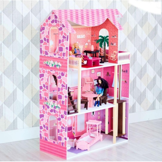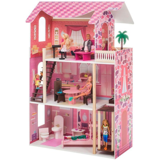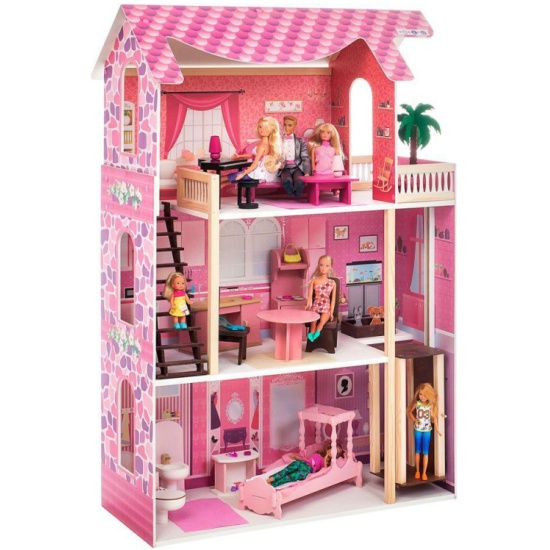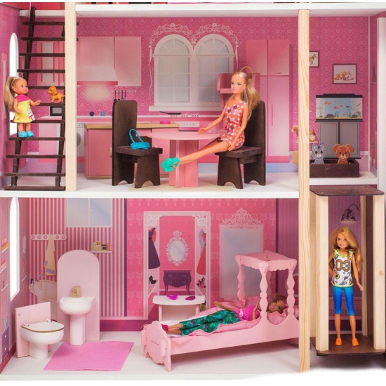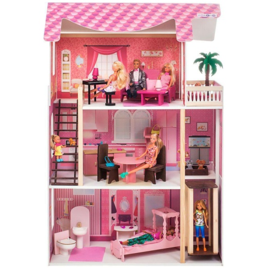 Домик, выполненн в классическом девечьим стиле, в насыщенном розовом цвете. Игрушку отличает насыщенный цветовой принт по дереву внутри дома с сочетанием ярких, пастельных оттенков розового, мощное наполнение аксессуарами. Домик предназначен для девочек старше трехлетнего возраста. Игрушечный дом для кукол "Монте-Роза" частично открытый (задняя стенка глухая, все игровые зоны с лицевой стороны полностью доступны для игры) Разработан специально для кукол высотой до 30 см (так называемый, Барби-формат). Размеры домика "Монте-Роза" в собранном виде (ДхГхВ): 76 х 33 х 105 см. Вес игрушки: 20 кг. Для декорирования интерьеров используется инновационная технология нанесения рисунка на дерево, благодаря чему декор дома более устойчив к выцветанию и механическим повреждениям во время игры, чем стандартная технология наклеенного и ламинированного бумажного декора. Упаковка: транспортная картонная коробка. Характеристики: Вес нетто: 20 Материалы:МДФ, дерево Размеры (габариты): 76 х 33 х 105 Размеры упаковки: 83 х36 х22 Объем: 0, m3 Штрихкод: 4601504033837 Страна бренда: Россия Комплектация: 19 предметов мебели и аксессуаров. В данной модификации дома – 1 лестница, лифт, балкон, 3 этажа, 4 комнаты. ВНИМАНИЕ: Куклы, текстиль приобретается отдельно!