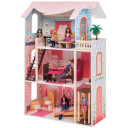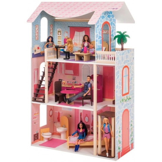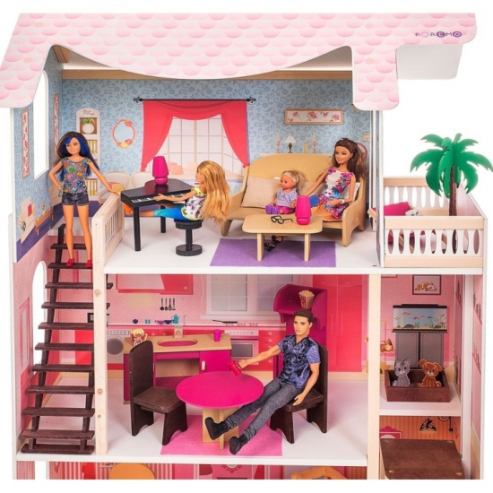 Домик, выполнен в классическом девичьем стиле, в насыщенном розовом цвете. Игрушку отличает насыщенный цветовой принт по дереву внутри дома с сочетанием ярких, пастельных оттенков розового, мощное наполнение аксессуарами.