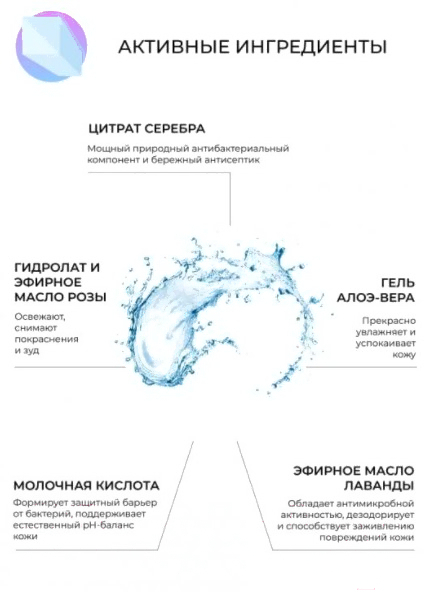 • Активные ингредиенты масло лаванды, молочная кислота, экстракт алоэ, цитрат серебра, гидролат розы, масло розы