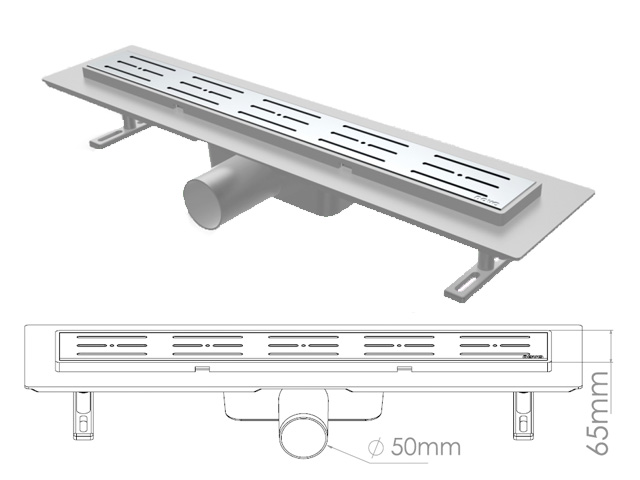 Сливной трап горизонтальный D 50, решетка нерж. с площадкой под плитку, 65х600мм полоски, NOVA 5203.001