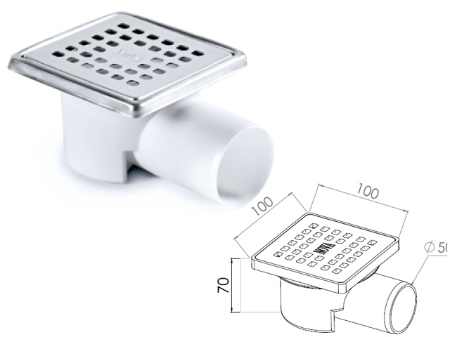 Сливной трап горизонтальный D 50 с сухим затвором, с рамкой, решетка нерж. 100х100 мм, NOVA 5057