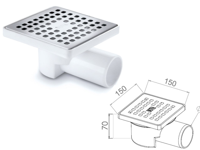 Сливной трап горизонтальный D 50, с сухим затвором, решетка нерж. 150х150 мм, NOVA 5026