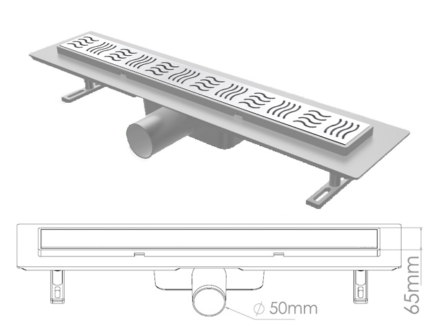 Сливной трап горизонтальный D 50, решетка нерж. с площадкой под плитку, 65х700мм волна, NOVA 5204.003
