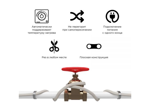 Саморегулируемый греющий кабель предназначен для защиты от замерзания бытовых трубопроводов среднего диаметра, счетчиков воды, вентилей и т.п. Предназначен для устройства на трубопроводах, диаметром не более 150 мм. Длина и мощность электрообогревателя выбирается исходя из длины трубы и толщины.