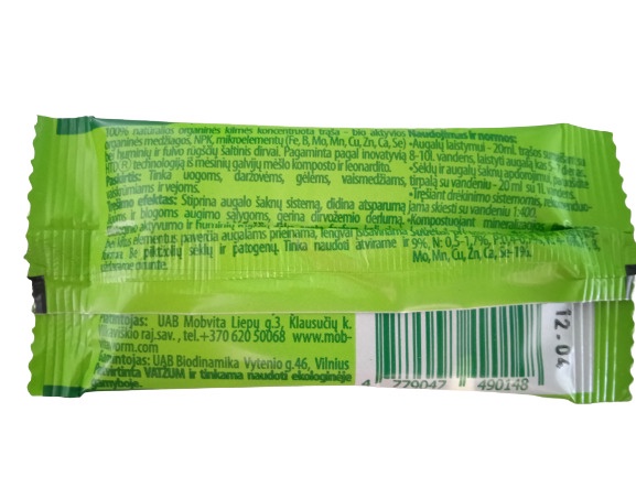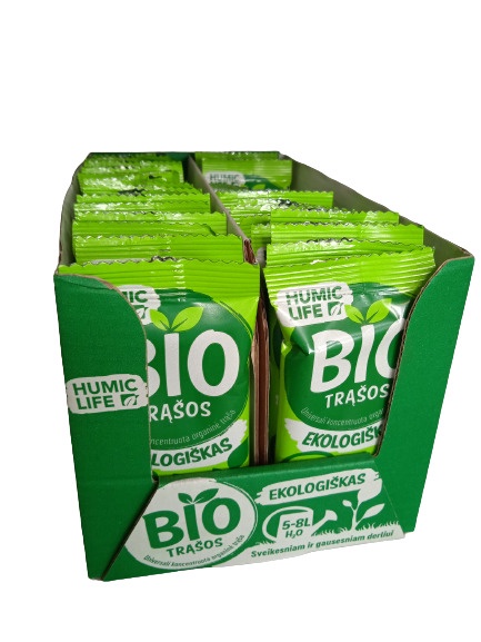 - Дополнительная информация - Dirvožemio derlingumo savybėms gerinti. - Sėkloms apvelti ir sodinamajai medžiagai apdoroti. - Tręšti per laistymo sistemas, laistyti kapiliarine sistema į augalo šaknų zoną. - Ražienų, šiaudų likučių mineralizacijos procesams skatinti. - Tinka visoms žemės ūkio kultūroms. Naudojimo rekomendacijos: Dirvožemio derlingumui gerinti: Pavasarį – paruoštu ir išmaišytu tirpalu su vandeniu lieti ar išpurkšti dirvą prieš sėją ar sodinimą, norma 5–10 l/ha, vandens kiekis – 200–250 l/ha. Rudenį – paruoštu ir išmaišytu tirpalu su vandeniu lieti ir išpurkšti ražienas arba prieš sėją, norma 6–10 l/ha, vandens kiekis – 200–250 l/ha. Sėkloms apvelti: Tirpalą sunaudoti per 6 valandas, apvėlus 12–14 % drėgnumo sėklą galima laikyti mėnesį, sandėliuose išlaikant minimalius temperatūros svyravimus, norma – 1 tonai sėklų 1–2 l. Sodinamajai medžiagai apdoroti: Sodinukų šaknims apdoroti pagaminti 5–10 % koncentracijos tirpalą, šaknis mirkyti 4–8 h. Sodininkams ir daržininkams, turintiems nedidelius šiltnamius ar daržus, rekomenduojama produktą naudoti laistant įprastu laistytuvu. Šiam reikalui pagaminta patogi lanksti 20 ml talpos pakuotė. Į laistytuvą, pripildytą vandens, įpilti biotrąšų (HUMIC LIFE) ir išmaišyti. Rekomenduojama skiedimo norma: viena pakuotė 20 ml gelio ir 5–8 l vandens, rekomenduojama laistyti kas 5–7 d. Pagamintu tirpalu galima laistyti visas daržoves, uogas, gėles, vejas, vaiskrūmius, vaismedžius atvirame ir uždarame grunte.