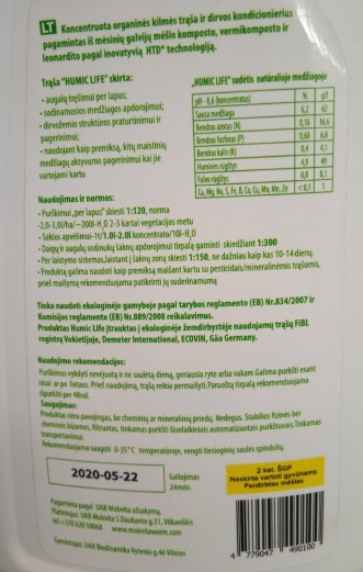 - Дополнительная информация Naudojimo rekomendacijos: tręšiant augalus per lapus, naudoti intensyvaus augimo metu, 2–3 kartus vegetacijos metu; norma – 3 l/ha; augalus laistant, naudoti vegetacijos metu, daryti 7–10 d. pertraukas; norma – 1 l/300–400 l H2O; sėkloms apvelti – 1 t grūdų 2 l; sodinukų šaknims apdoroti daryti tirpalą 1:100 su H2O; dirvai praturtinti purškiant, priklausomai nuo dirvožemio savybių, norma – 5–10 l/ha.