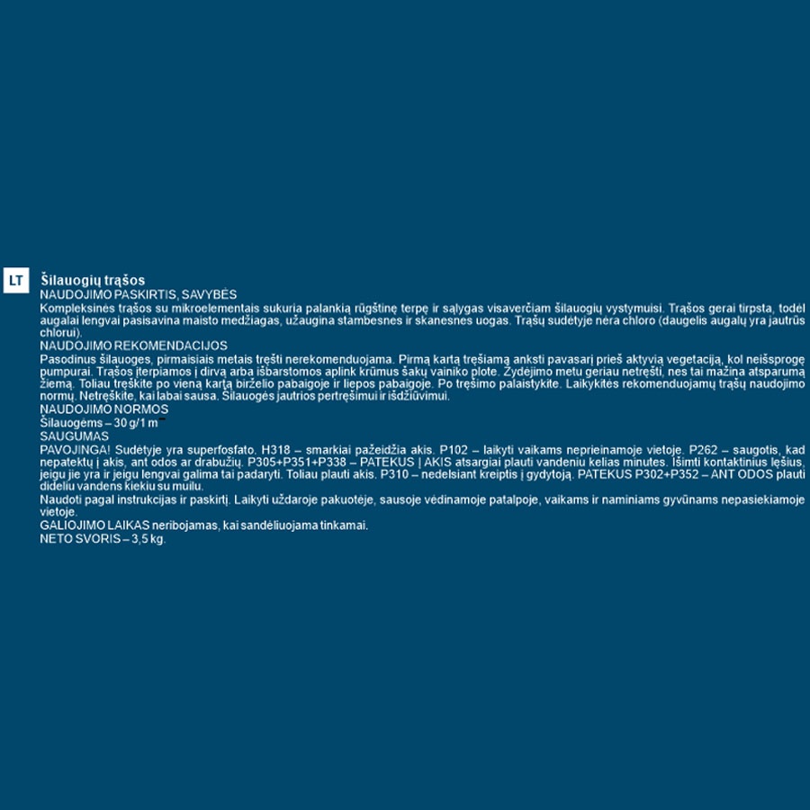 - Дополнительная информация Pasodinus šilauoges, pirmaisiais metais tręšti nerekomenduojama. Pirmą kartą tręšiama anksti pavasarį prieš aktyvią vegetaciją, kol neišsprogę pumpurai. Trąšos įterpiamos į dirvą arba išbarstomos aplink krūmus šakų vainiko plote. Žydėjimo metu geriau netręšti, nes tai mažina atsparumą žiemą. Toliau tręškite po vieną kartą birželio pabaigoje ir liepos pabaigoje. Po tręšimo palaistykite. Laikykitės rekomenduojamų trąšų naudojimo normų. Netręškite, kai labai sausa. Šilauogės jautrios pertręšimui ir išdžiūvimui.
