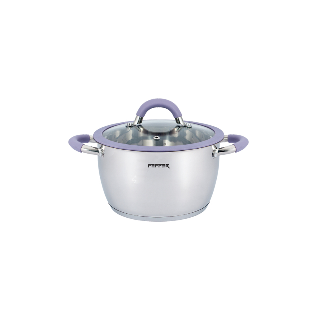 Виготовлена з високоміцної нержавіючої сталі найвищої якості. Міцність та товщина виробів варіюється від 0,3 до 0,7 мм. Такий посуд призначений для інтенсивного, довговічного використання. Має високий рівень стійкості до зносу, подряпин та деформації, не піддається корозії. Ручки, що не нагріваються, з нержавіючої сталі з надійним кльопочним кріпленням і силіконовими накладками лавандового кольору. Є внутрішні відмітки літражу; мірна шкала. Такий посуд можна використовувати на всіх типах нагрівальних приладів – газових, електричних, керамічних, галогенних та індукційних плитах.