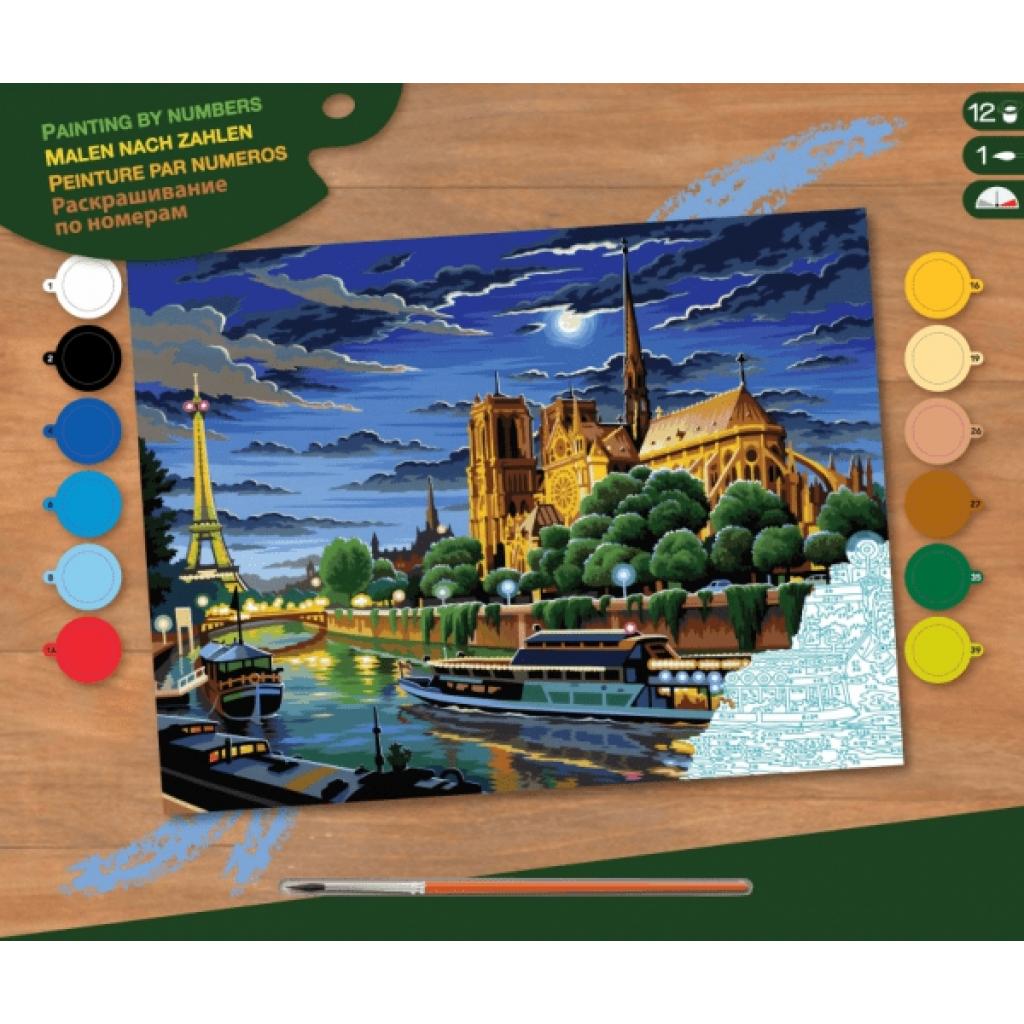 Картина з пейзажем нічного романтичного Парижа. Такий твір мистецтва може створити кожен завдяки набору для творчості «Картина по номерам». Писати картину дуже просто, адже на спеціальному полотні вже нанесені відповідні контури ділянок. Серед контурів номер фарби, якою треба зафарбовувати певну ділянку. Для початку творчості не потрібно нічого додаткового; з набором можна одразу починати процес написання картини. Для дітей від 10 років.