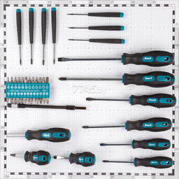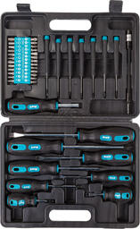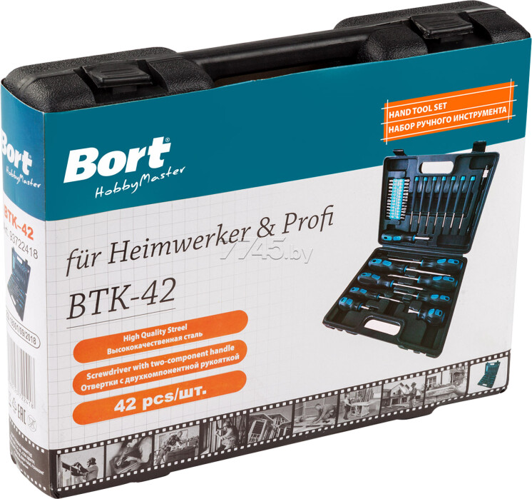 Набор инструментов 1/4" 42 предмета BORT BTK-42 (93722418) надежный помощник при выполнении ремонтных, монтажных и демонтажных работ. Предназначен для использования любителями и профессионалами. Комплект станет полезным подарком всем, кто делает всё своими руками. Все составляющие собраны в легкий, но при этом прочный кейс для удобного хранения и транспортировки. В состав набора входят 25 всевозможных видов бит размером 25мм для разных типов саморезов, отвертка-держатель для бит, гибкий удлинитель для уверенной работы в труднодоступных местах, 8 отверток с различной длиной ручки, 7 часовых отверток 50мм для работы с техникой, например, компьютером или телефоном. Все инструменты изготовлены из высококлассного металла, а биты — из хром-ванадиевой стали для особой прочности. Двухкомпонентная рукоятка отверток делает инструмент надежным и продлевает его срок службы.