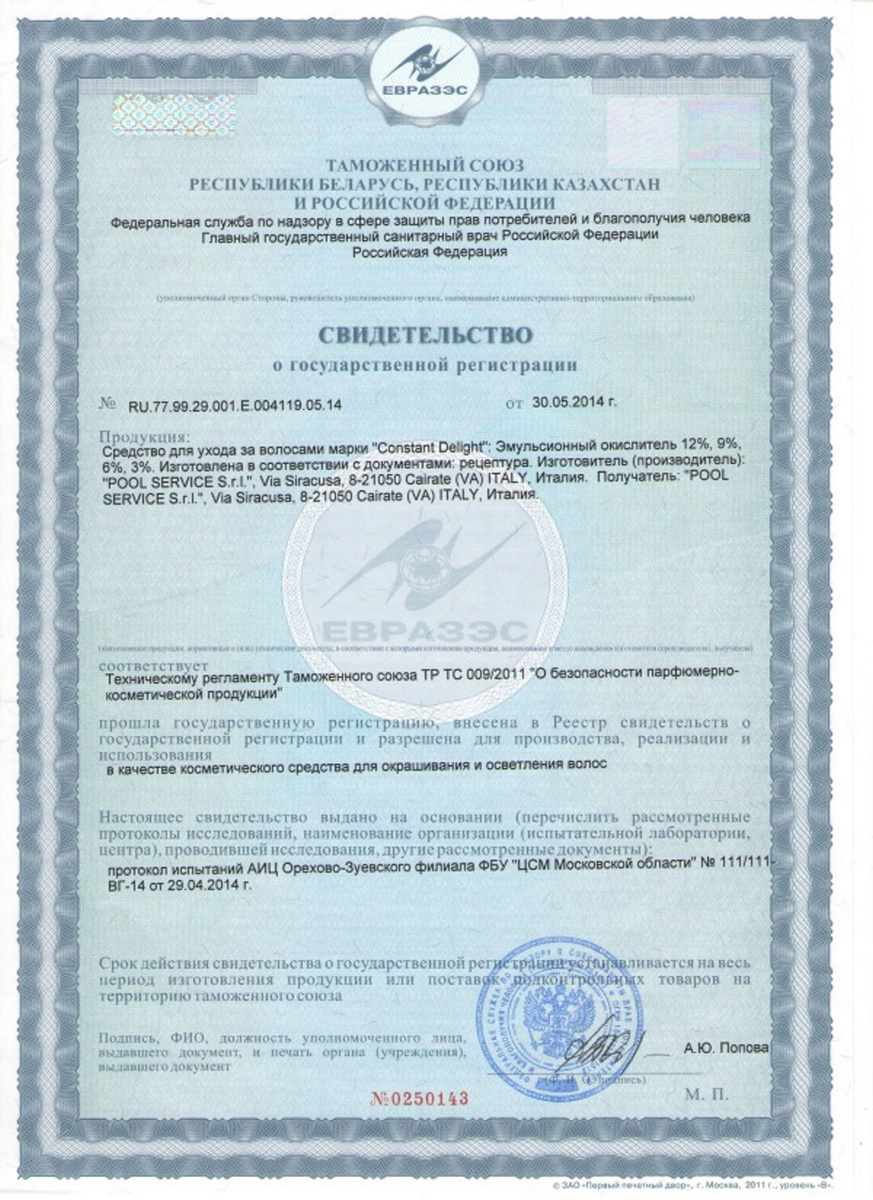 - Способ применения: Взять одну часть эмульсионного окислителя, перемешать с одной частью крем-краски Constant Delight или осветляющего порошка, нанести на волосы и оставить для воздействия на 10-45 минут, в зависимости от техники окрашивания.