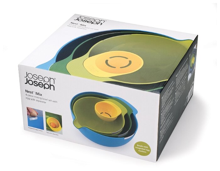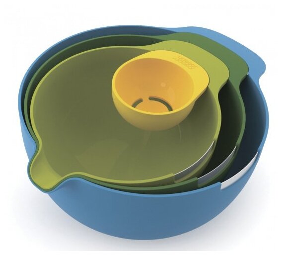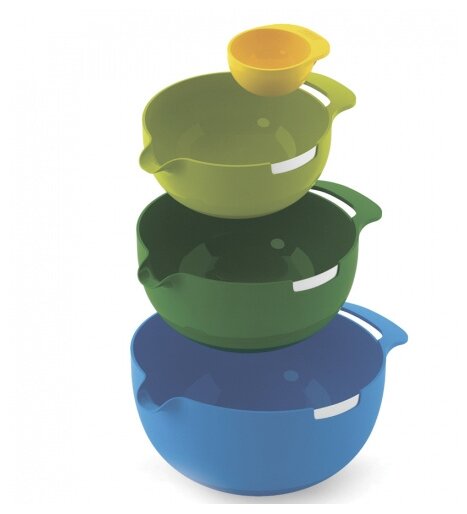 - Дополнительная информация каждая из трех мисок (объемом 3,8, 2,4 и 1,4 литра) оснащена стальным краем на ободке для разбивания яиц и носиком для выливания готовой смеси, в комплект входит емкость для отделения яичных белков, которую можно прикрепить к краю любой из мисок