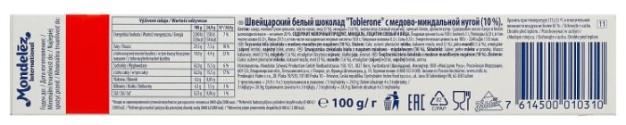 - Состав сахар, масло какао, молоко сухое цельное, мед (3%), миндаль (1,6%), эмульгатор (соевый лецитин), яичный белок, ароматизатор ванилин