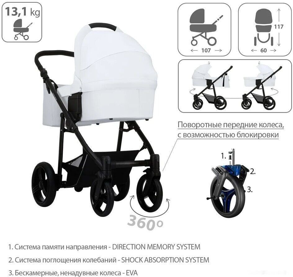 Универсальная коляска, 2 в 1, люлька/прогулка, 4-колесная, шины цельные, вес 13.1 кг.