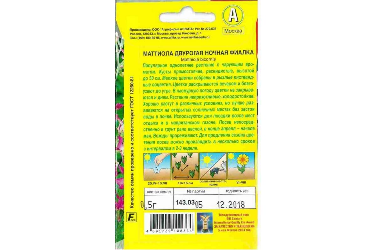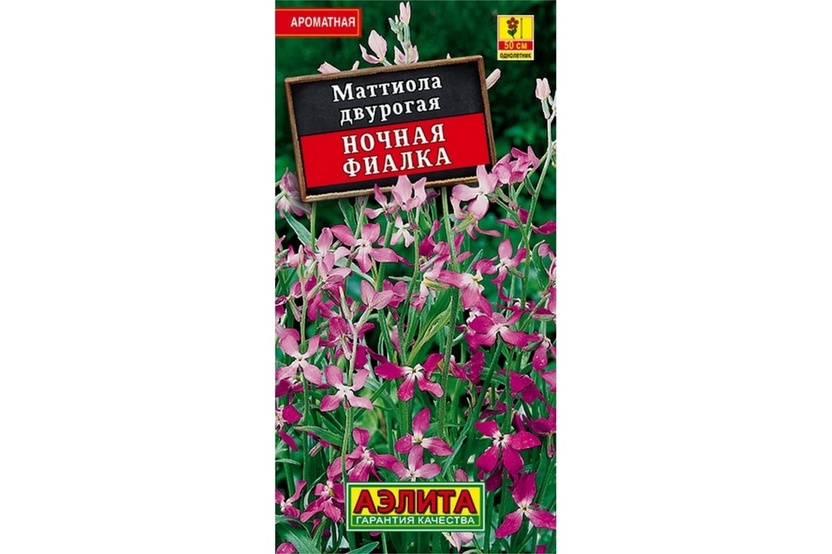 Семена Аэлита Маттиола Ночная фиалка 0.5 г 4601729100864 - декоративный однолетник. Растение с чарующим ароматом. Кусты прямостоячие, раскидистые, высотой до 50 см. Мелкие цветки собраны в рыхлые соцветия. Цветки раскрываются вечером и благоухают до утра. В пасмурную погоду цветки не закрываются и днем. Растения неприхотливые, холодостойкие.