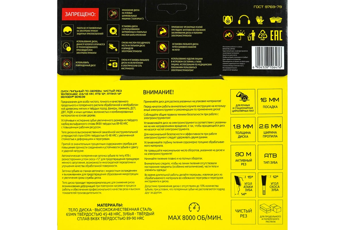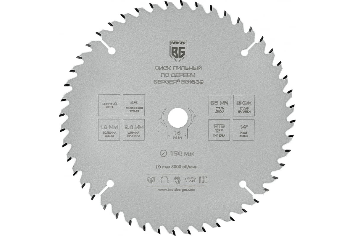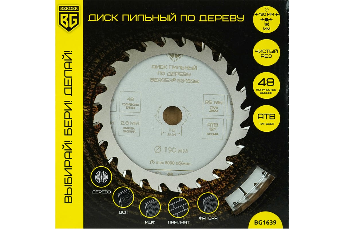 Диск пильный по дереву и ДСП чистый рез 190x16 мм, 48z, 2.6x1.8 мм, ATB 12 Berger BG BG1639 предназначен для использования в ручных и стационарных циркулярных пилах для поперечного и продольного распила мягкой и твёрдой древесины, ДСП, МДФ, ламината.