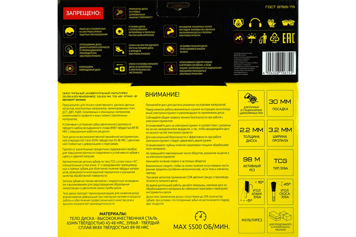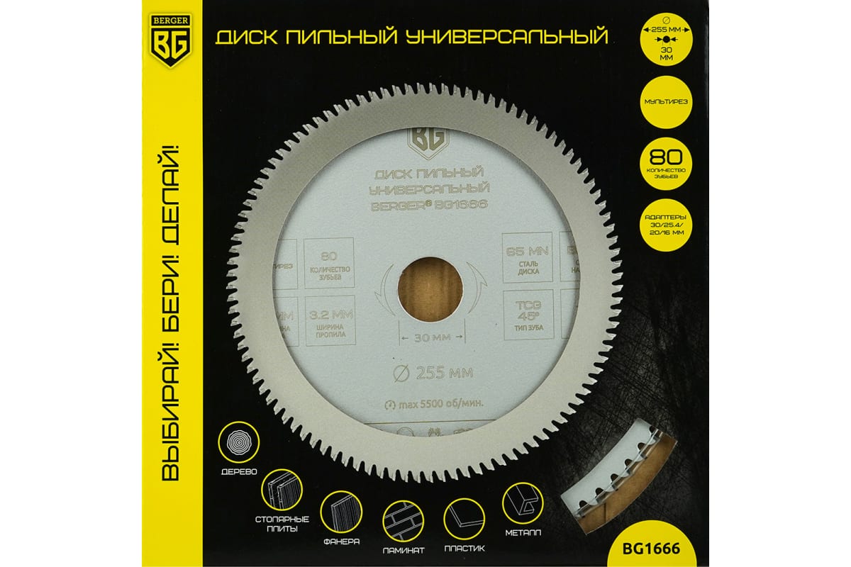 Диск пильный универсальный мультирез 255x30x25.4x20x16 мм, 80z, 3.2x2.2 мм, TCG 45, атака -5 Berger BG BG1666 предназначен для использования в ручных и стационарных циркулярных пилах для чистого многозадачного реза древесины, столярных слоёных плит, ламината, пластика, алюминия и других цветных металлов.