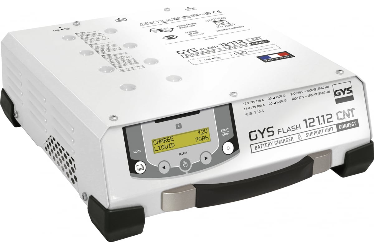 Зарядное устройство GYS Gysflash 121.12 CNT FV 026971 заряжает все типы аккумуляторов. Зарядка: для свинцовых или литиевых аккумуляторов 12 В емкостью от 20 до 1500 Ач.