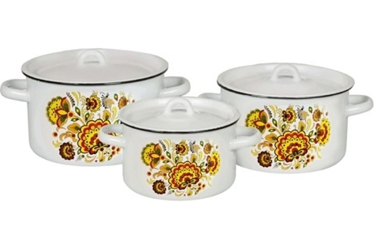 Эмалированный набор посуды СТАЛЬЭМАЛЬ 33 Хохлома 3 предмета, белоснежный, цилиндр, 1.5 л, 2.9 л, 4.5 л ТП192 предназначен для готовки.