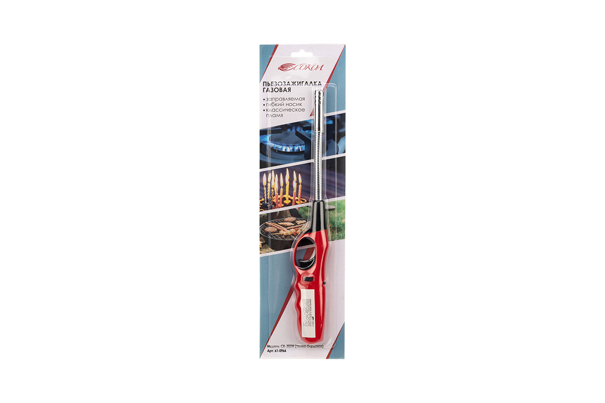 Бытовая газовая пьезозажигалка СОКОЛ СК-302W темно-бордовая, с гибким стержнем 61-0966 широко используется для поджига газовых горелок, резаков, плит и колонок.