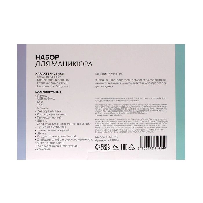 Набор для маникюра LuazON, лампа LUF-19, 18 диодов, 54 W, инструменты, лаки