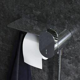 Весь продукт представляет собой удобную полочку, на которой можно разместить все, что необходимо вам под рукой. На интегрированном держателе можно размещать туалетную бумагу, а на крючке - полотенце.