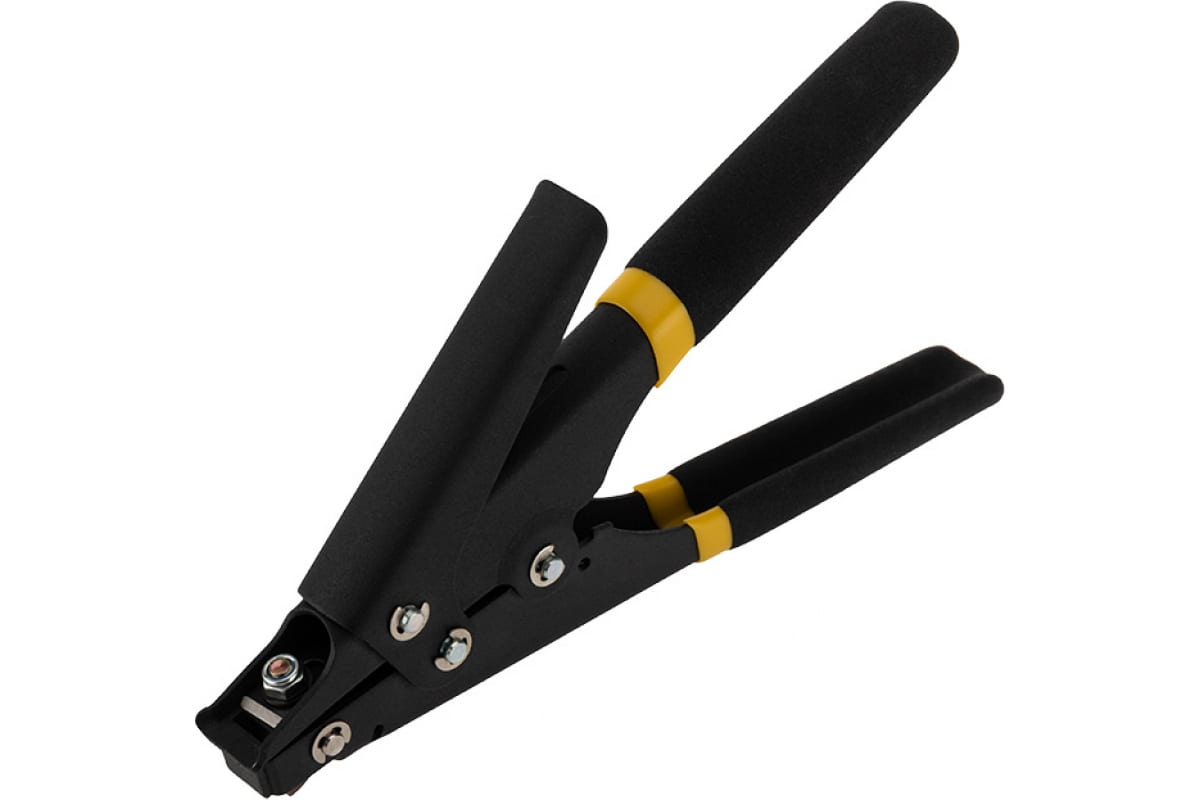 Конструкция позволяет быстро и легко монтировать даже самую широкую стяжку: одним сведением ручек затягивать хомут и обрезать излишки полотна нажатием на дополнительный рычаг.
