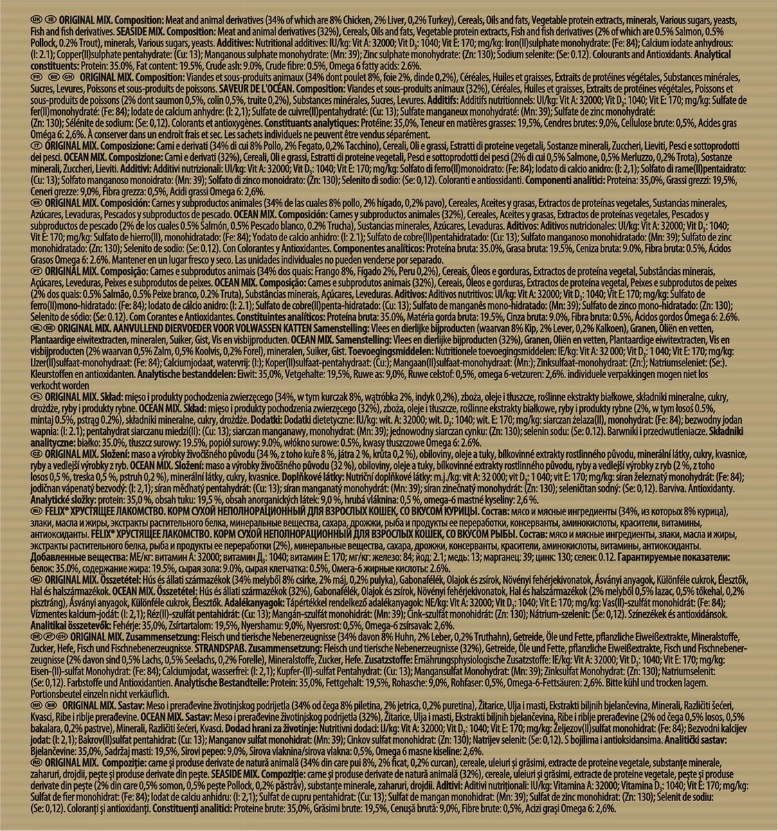- Состав Мясо и мясные субпродукты (34%, из них курица 8%), злаки, масла и жиры, экстракты растительных белков, минеральные вещества, различные сахара, дрожжи, рыба и рыбные производные. Мясо и мясные субпродукты, злаки, масла и жиры, экстракты растительных белков, рыба и рыбные субпродукты (2%).